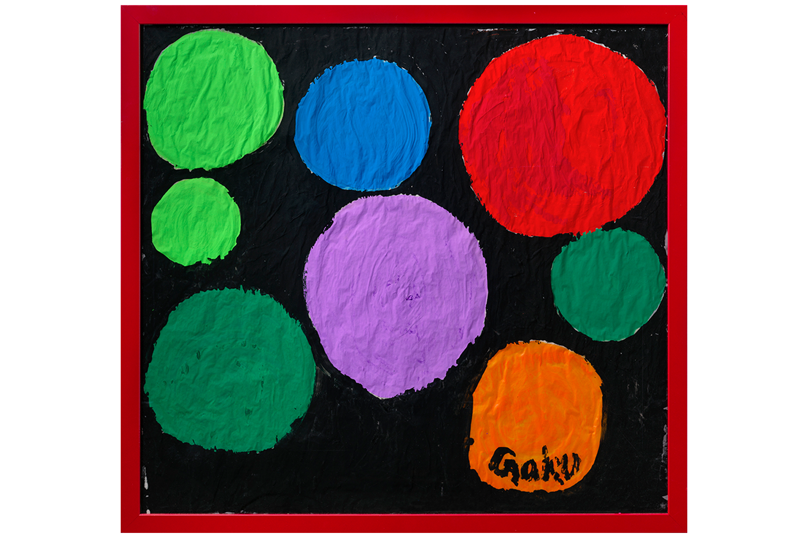 GAKU’s early paintings began by dividing the canvas and painting the areas separately. Then, when Coco showed him that he could paint a base color and then layer different colors on top, he started drawing circles. Coco thinks the reason why the initial shape was a circle, was that “the circle is the most comfortable shape for humans. Just as a baby likes round things, It was a shape suitable for his first step.”