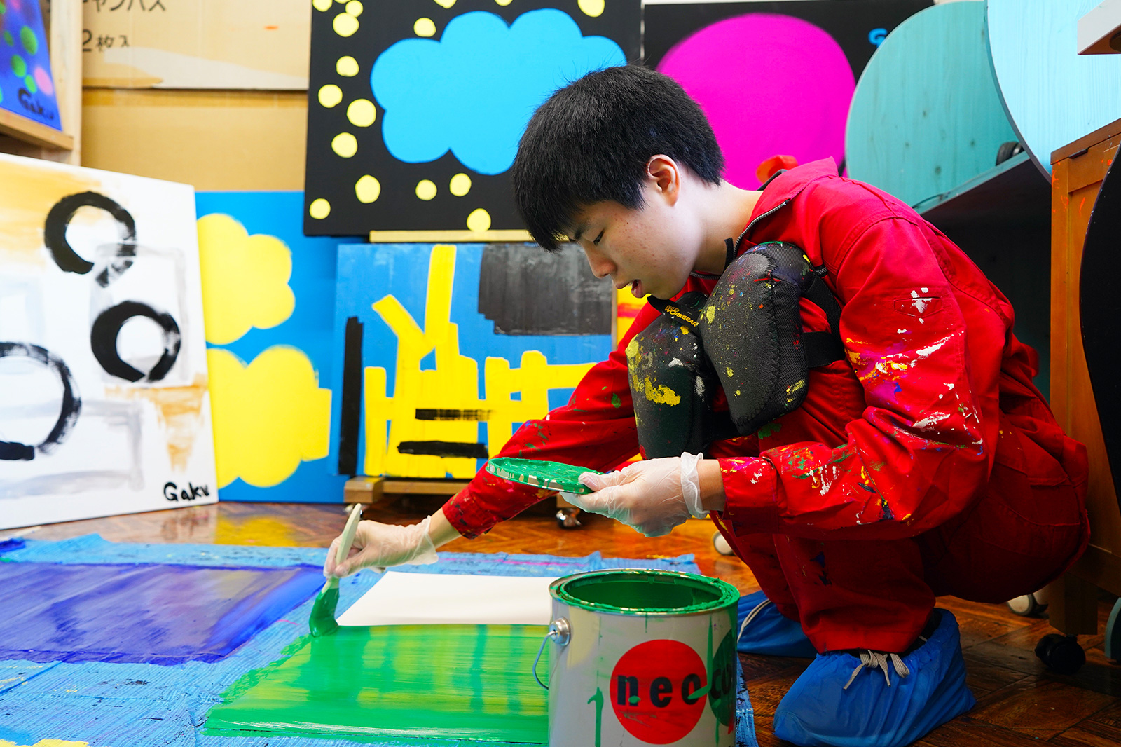 What kind of painting materials can GAKU use to express the feelings that he has accumulated inside of him? How can I create a more comfortable environment for him? To find out what he wants, I talk to him, give him new materials regularly, and just try to broaden his perspective physically and emotionally. From there, GAKU can choose what he wants to do himself. ” (Coco)